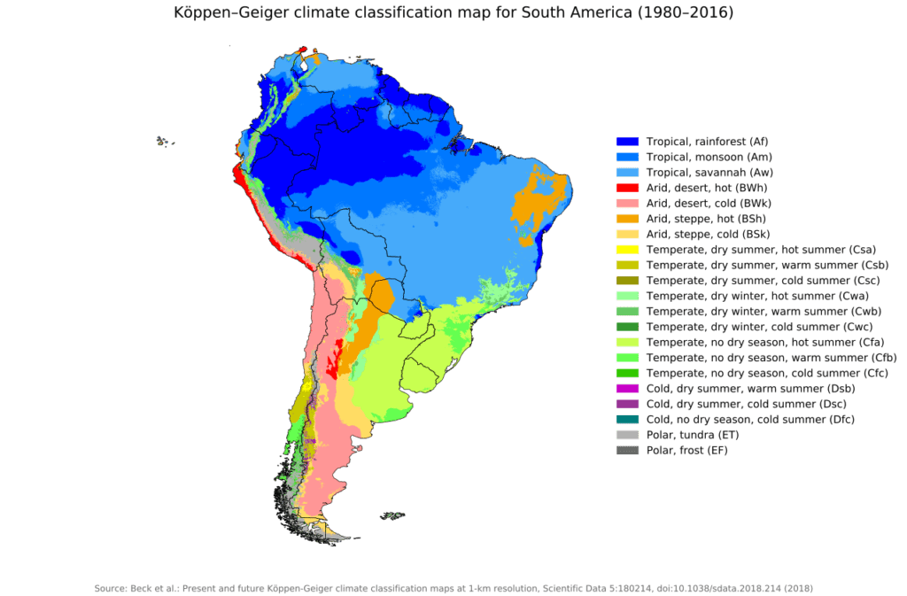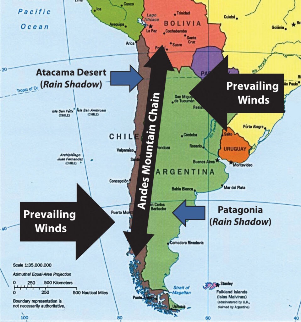 But most of all, what Argentina has is cold desert. In northern Argentina and the remainder of the north of South America, the prevailing winds are east to west, leaving all those deserts that we traveled on the west side of the Andes in the rain shadow of the Andes. However, in the southern end of South America, the prevailing winds are west to east, leaving all of Patagonia in the Rain Shadow of the Andes. Lucky you. Rain is unlikely to cost you a single minute of travel time after Cali Colombia, as we swap sides of the Andes to stay in the Rain Shadow for the entire trip until we hit Terra del Fuego.