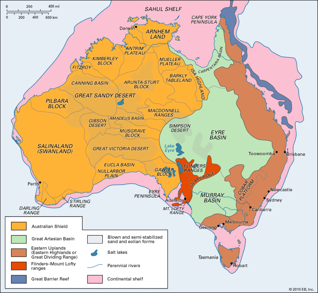 After Melbourne you will be heading down to the Murray Basin. Australia’s East Coast is dominated by the Great Dividing Range, which forms a sort of continental Divide, with rivers on the East side flowing the short distance to the sea, while on the west side everything flows into one of the three great basins that extend across the continent from north to south. To the north is the Carpentaria Basin, A number of small rivers flow into the ocean there during the rainy season and then dry up completely during the dry season. The center of the country is filled by the Eyre Basin. Most of the rivers in on the west side of the Great Dividing Range empty ultimately into Lake Eyre, which has no outlet. Lake Eyre is usually a large salt pan, but about every three years the rain is sufficient to temporarily fill it with water. The southern part of the basin strip is the Murray Basin. The Murray is Australia’s longest river at about 2,500 kilometers, but it does not flow north to south into the ocean, but instead comes out of the Great Dividing Range and flows west across the basin before turning south at the western edge of the basin and flowing into the ocean near Adelaide. Lake Eyre is also on the western edge of the Eyre Basin, as they tilt slightly from east to west.