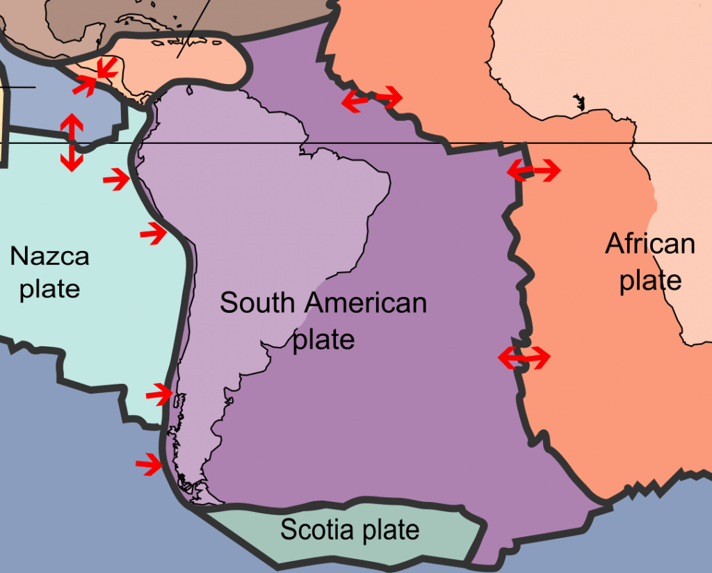 Picture the North American Continent making a partial spin counterclockwise as it slides to the east, and as it turns, that arm of the Caribbean bangs into the top corner of South America and pushes up a line of mountains .As it continues to pivot around the centerpoint that bottom corner of North America is moving east, even as the total mass of the continent is moving west, and it pushes the top half of that ridge of mountains it has created eastward, bending it… until it is suddenly yanked away by the rest of the continent, leaving the last part of the mountain ridge still pointing north…. Except hundreds of kilometers east of the bottom half, with the part bent eastward connecting the north pointing ends.