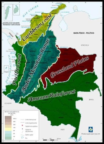 Between the Oriental and Central Andes is a wide high valley, drained by the Magdalena River. The much narrower valley between the Central and Oriental Andes is drained by the Cauca. Those two rivers join on the Caribbean Coastal Plain., and in those three regions reside most of the population of today’s Colombia.