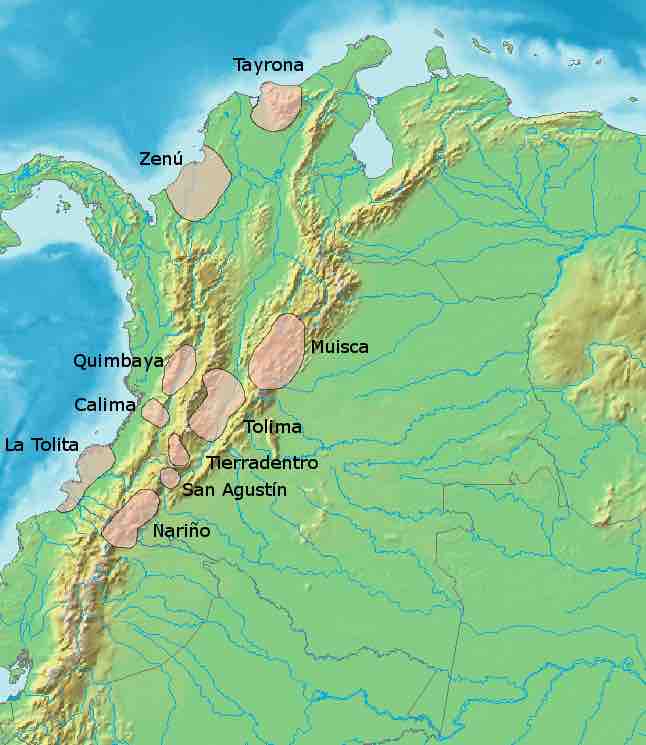 At the time of the Spanish conquest, the inhabitants of Colombia were Arawak, Carib and Chibcha and closely related to the inhabitants of Panama and the Caribbean. There never developed in this region the great civilizations like the Mesoamerican to the north, or the Andean to the south. At the time of the Spanish arrival, the Muisca Confederation, the Tairona Cheifdoms, and the Quimbaya civilization were the strongest native political units to stand in their way.