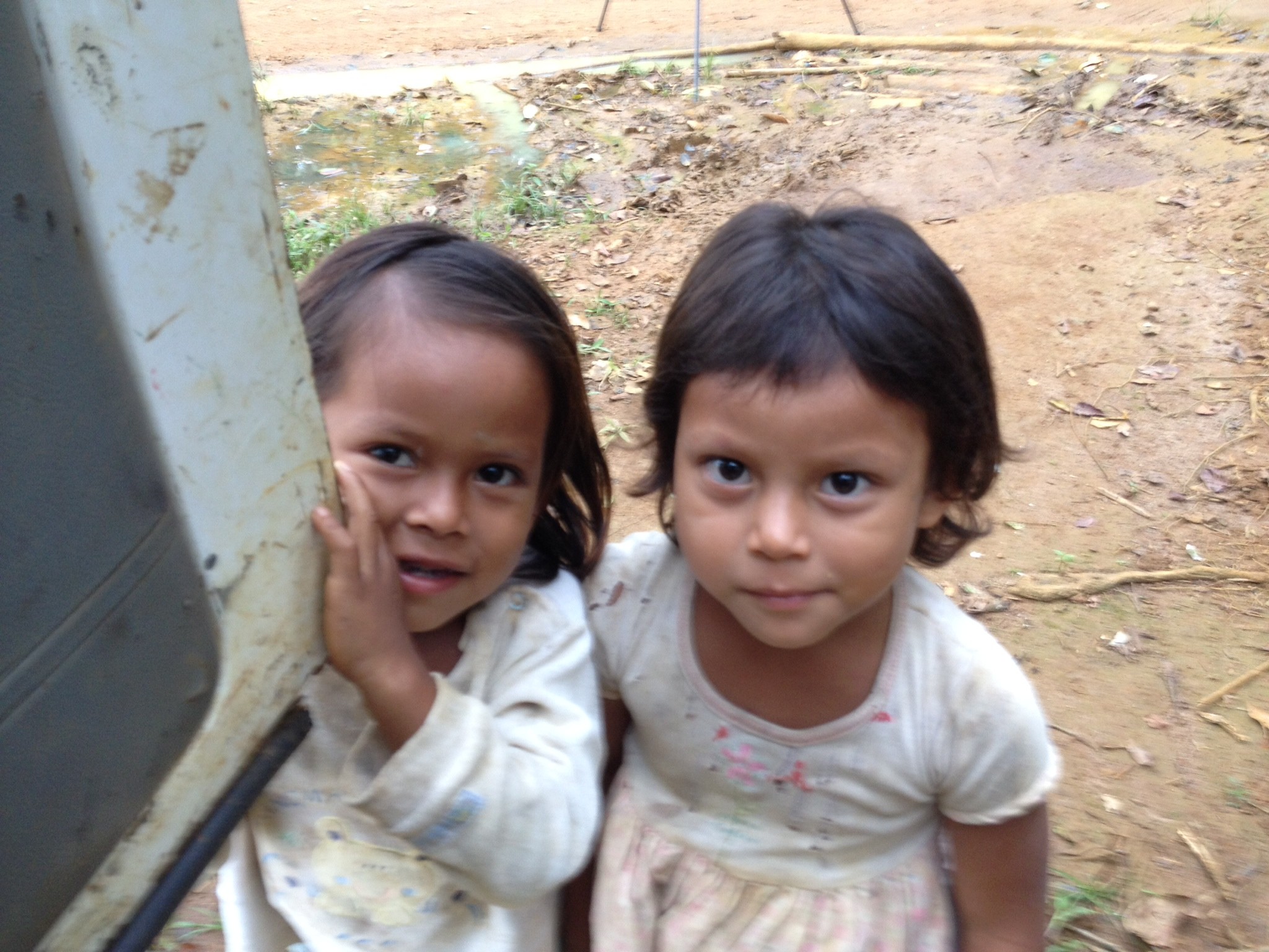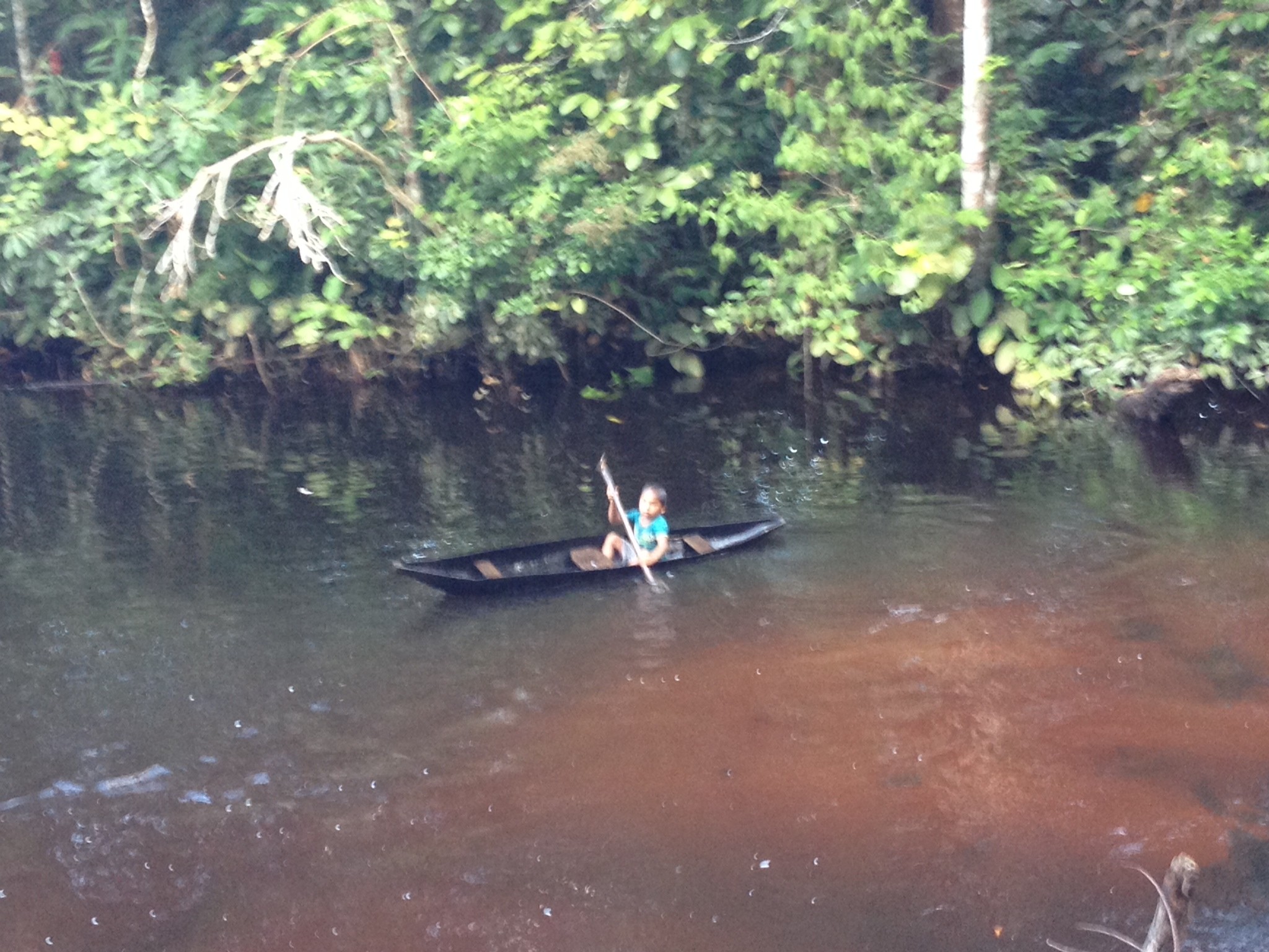 A young child paddling a dugout canoe. The stream’s color comes from the amount of tannin in the water