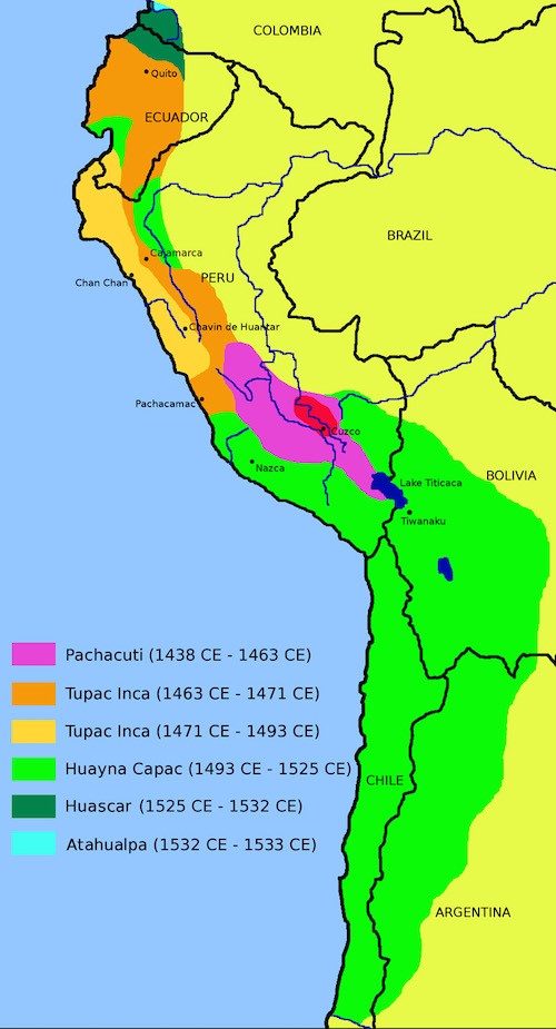Huayna died in 1527, and a few days later his heir also died of smallpox, which had arrived in the Inca Empire ahead of the Spanish. The legitimate next in succession was Huascar Inca from Cuzco, however he was challenged for the throne by Atahualpa of Quito and a bloody civil war ensued. The key battle of the war was fought in Ecuador near Riobamba, with Atahualpa winning, and pursuing Huascar’s armies into Peru, where Huascar was defeated again in the battles of Chimborazo and Quipaipan in 1532, finally taking Huascar prisoner.